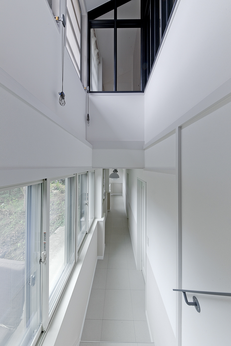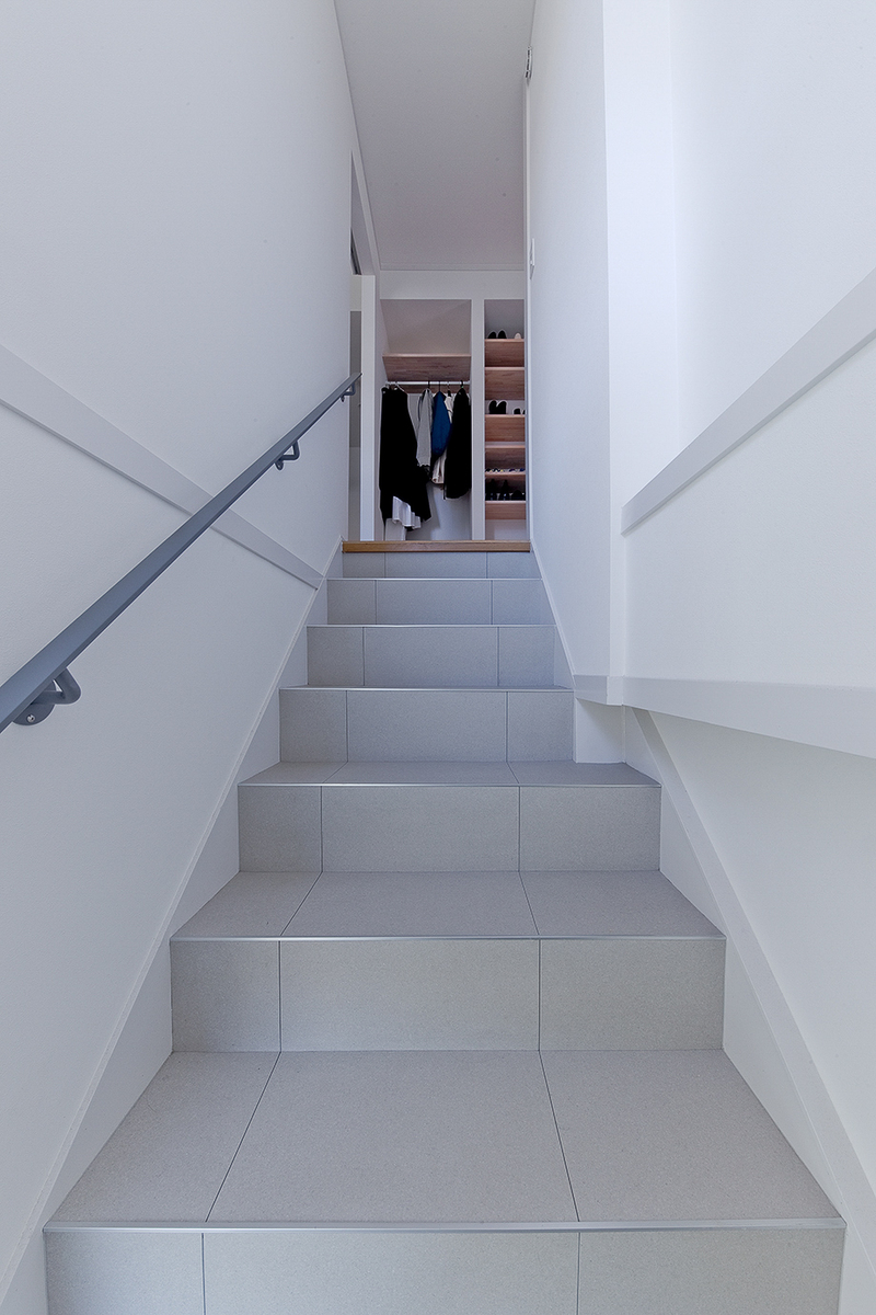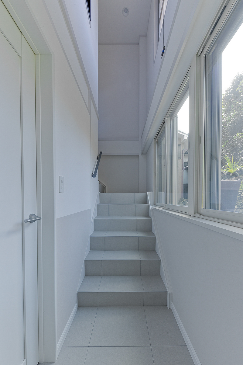 半地下へ向かう階段には、造作の室内窓を設置し、自然光が入りやすい工夫を。