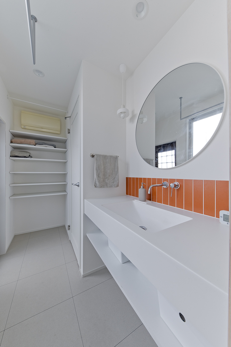 洗面台にはオレンジのタイル、廊下はクロスを色で貼り分け。