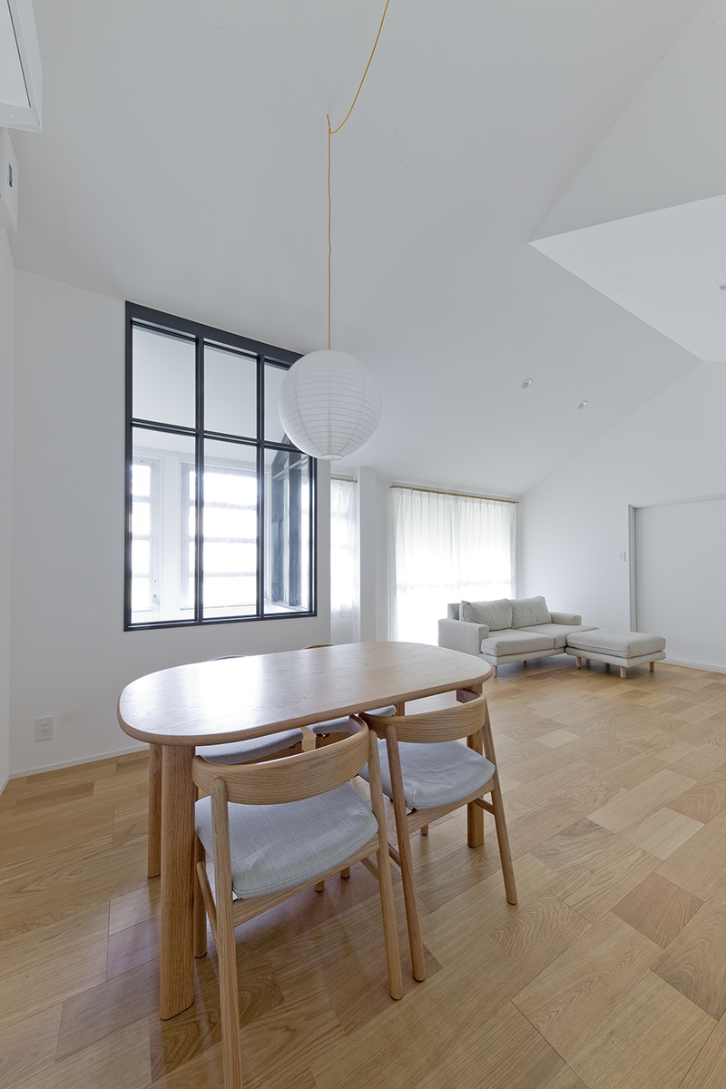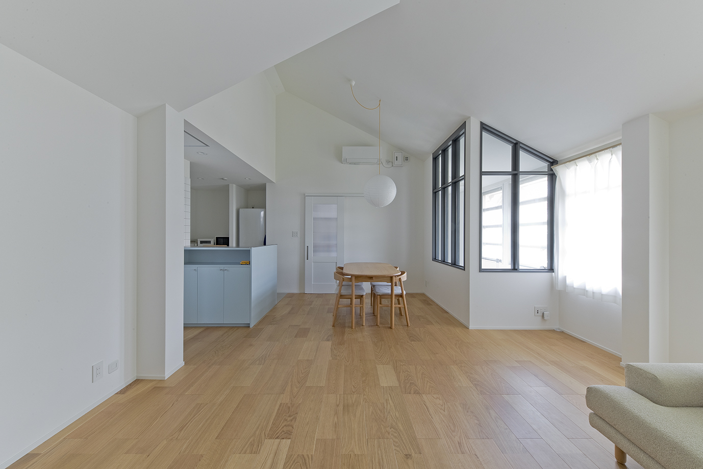 家の特徴でもある三角の天井はそのまま生かし、あえて手を加えず、空間の魅力として引き立てています。