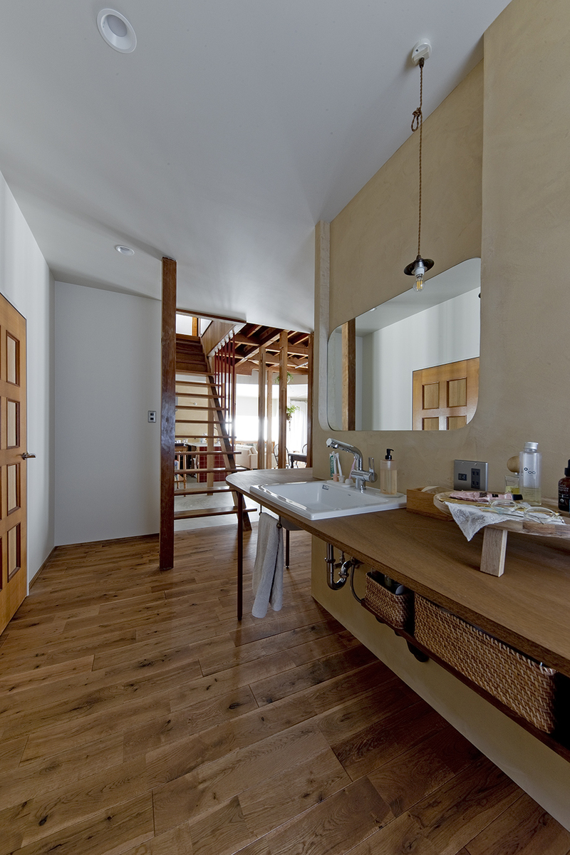 洗面スペースはLDKと同様、暖色系のカラーをアイアンの脚に取り入れて全体でまとまりのある空間に。作業台と洗面をセットで取り付けたRカウンターも住まいのアイコンとなっています。