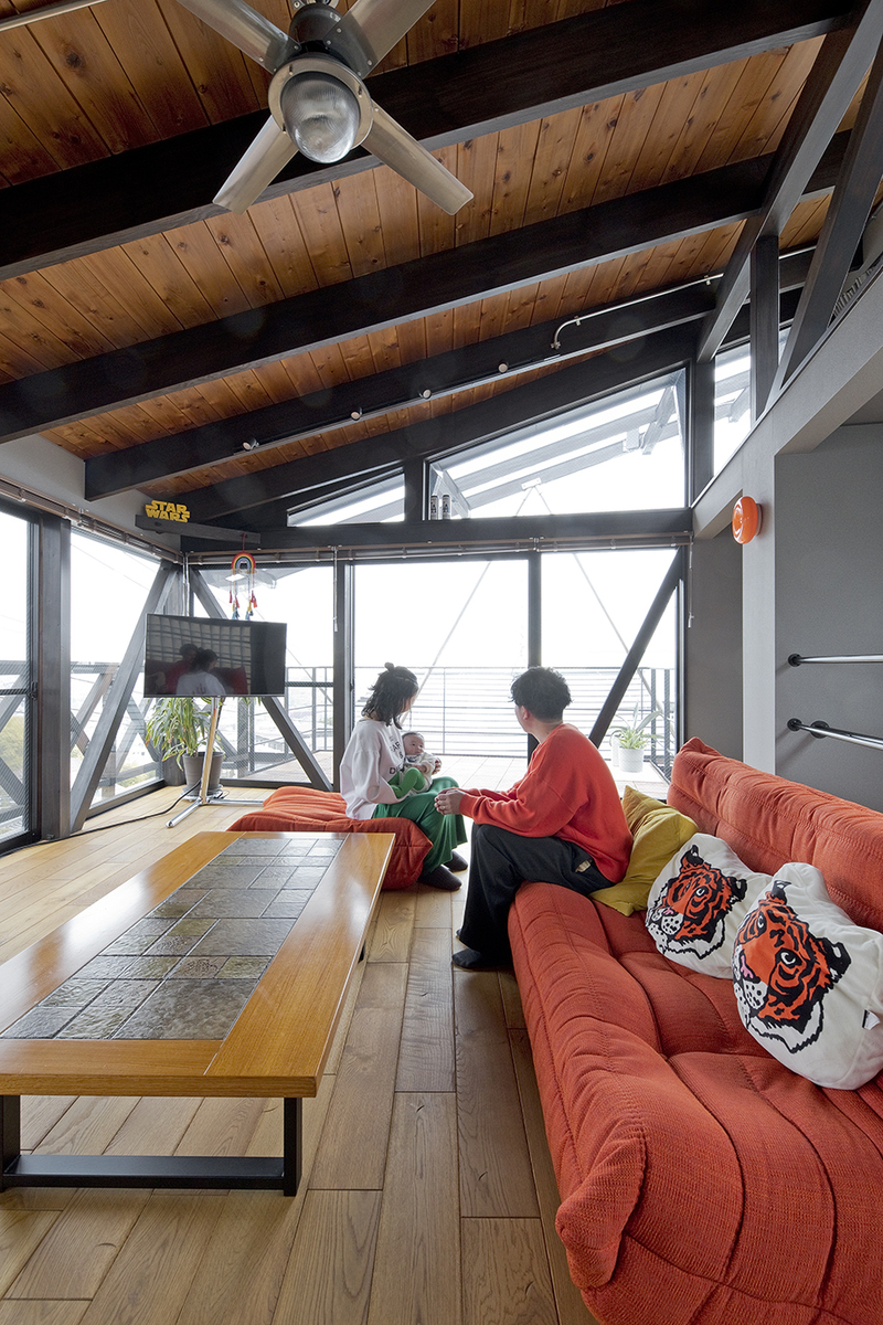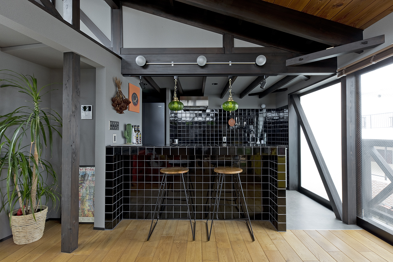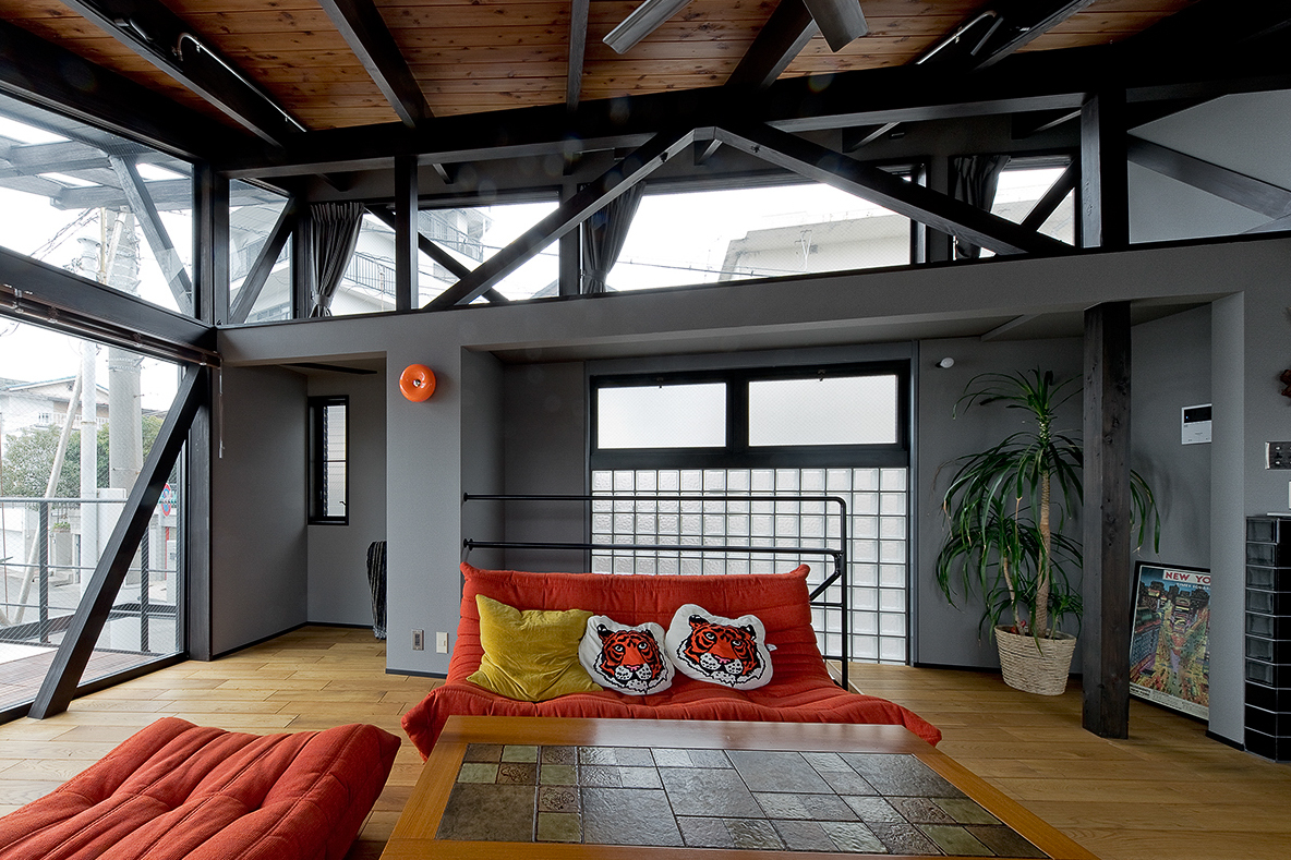 窓が多く明るい空間だからこそ、梁に濃い色の塗装を施すなど内装部分に深みのあるトーンを取り入れています。