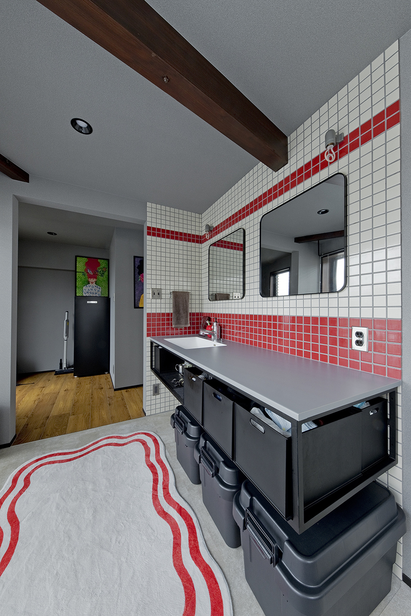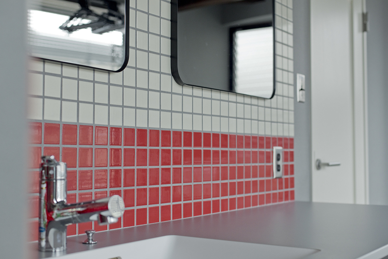 洗面は、色を取り入れたデザインをご希望されたことから、赤いタイルを採用。
