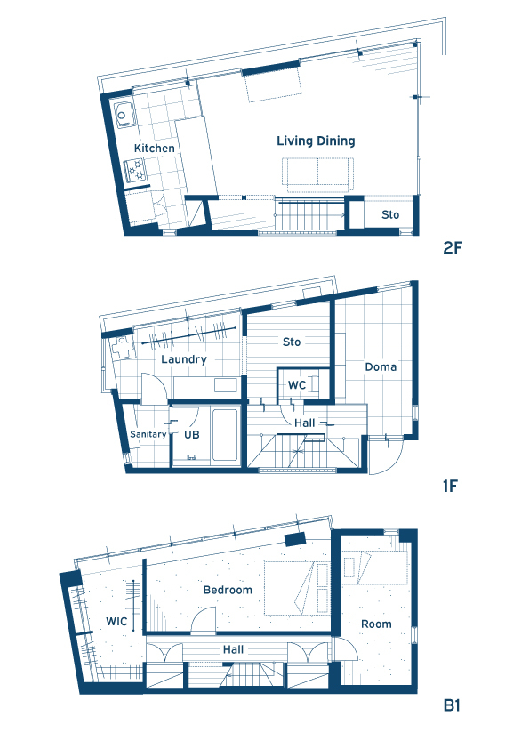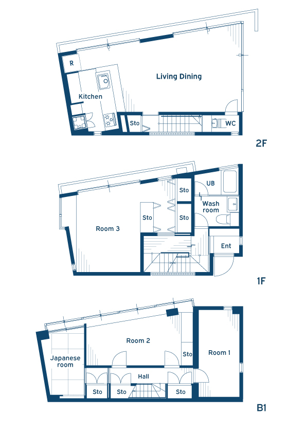 地下・1階・2階と縦に重なる、ユニークな構造の一軒家。