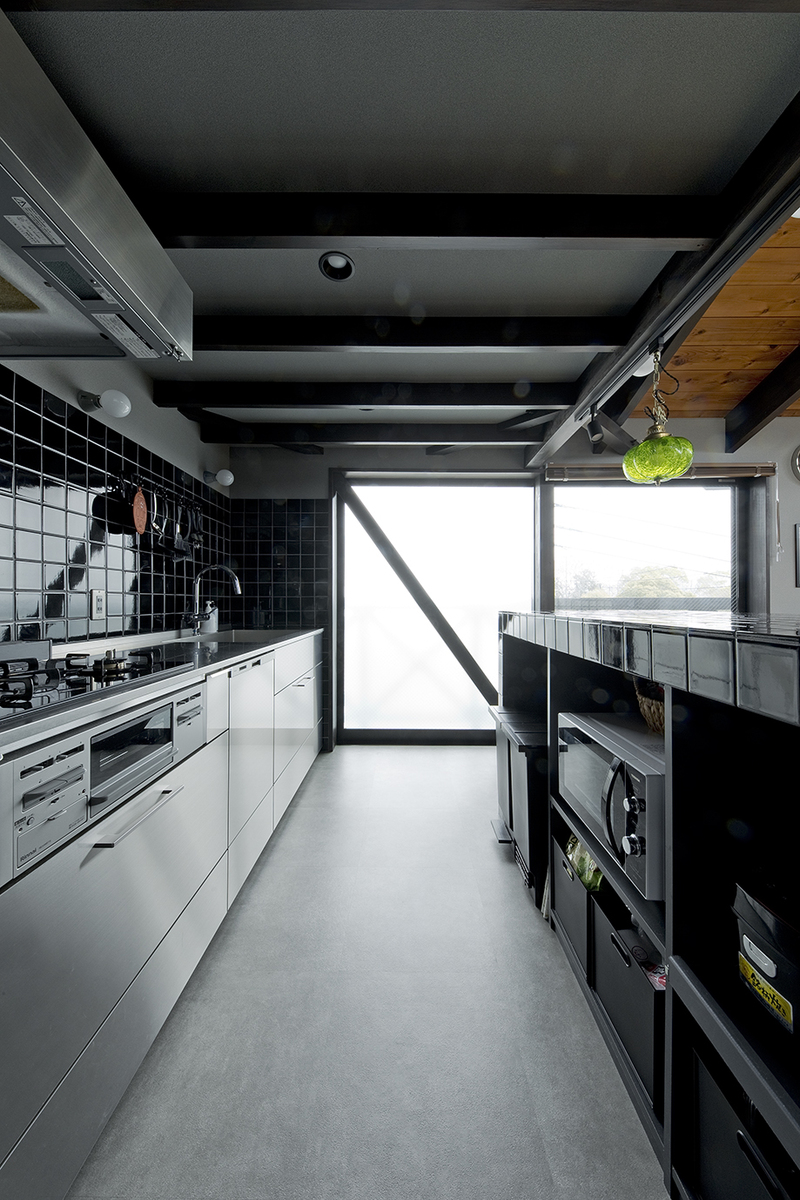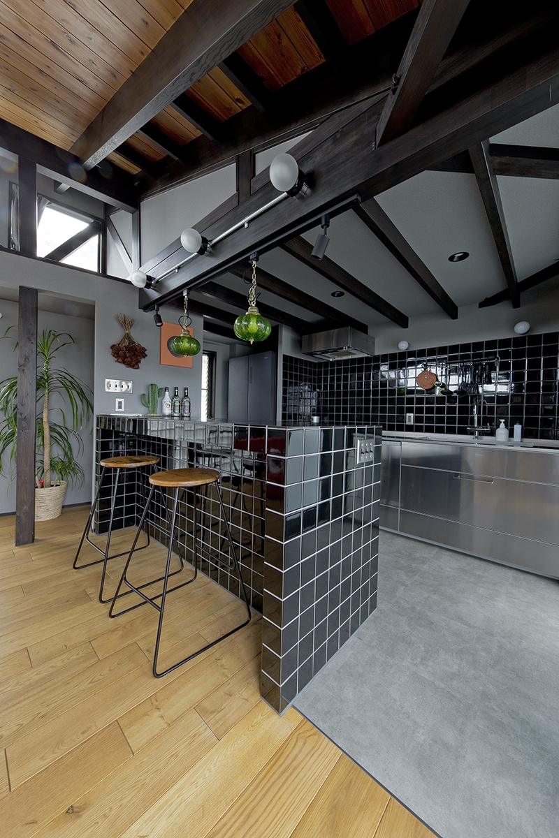 キッチンは格好いい雰囲気をご希望され、ダークトーンのタイルを取り入れた、作業カウンターを造作。