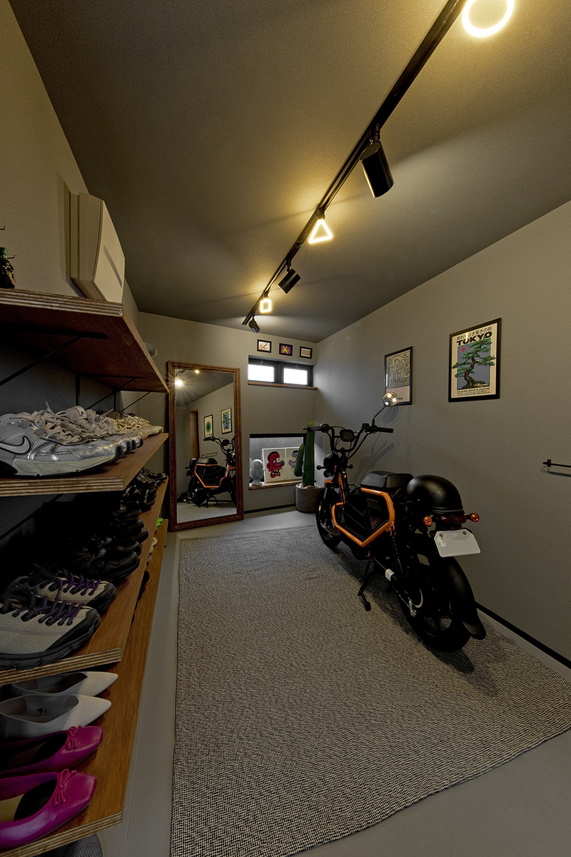コンパクトだった玄関は、バイクやベビーカーも置けるゆとりのある空間へと変更。
