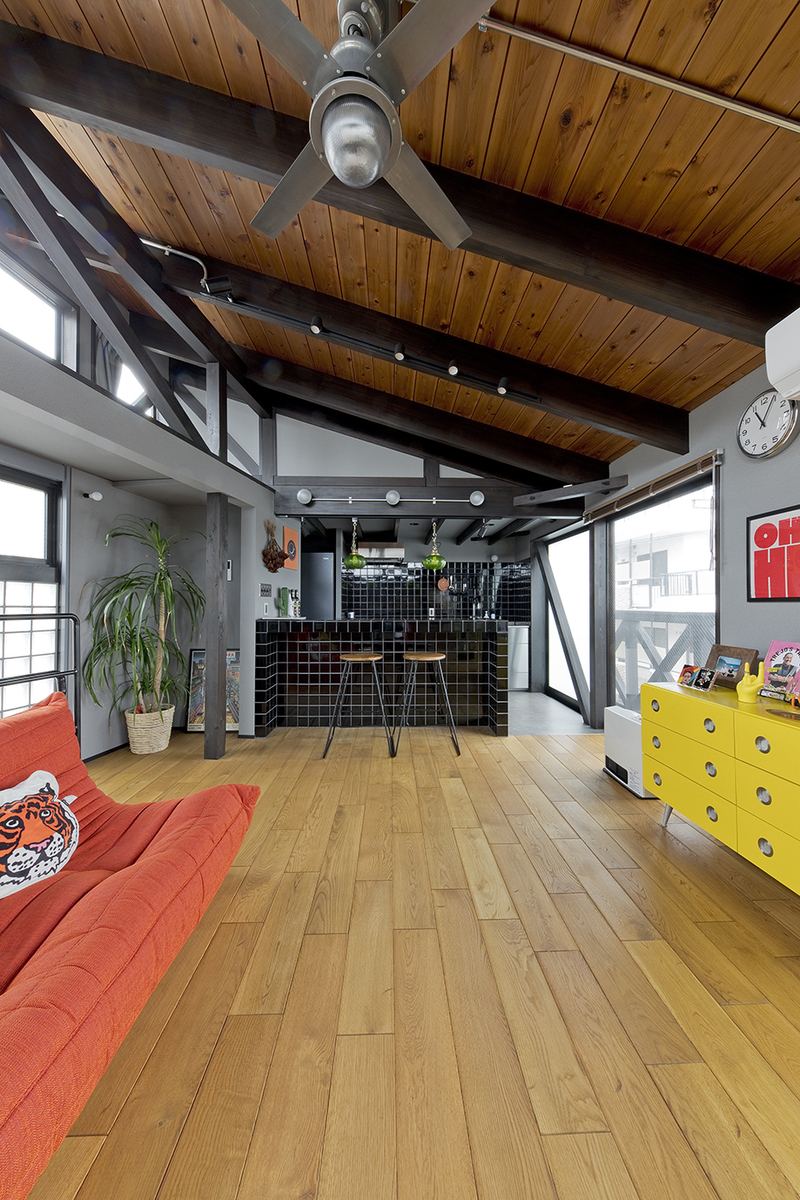 フローリングの色を天井に寄せることで、全体のばらつきを整えながらモダンな印象に仕上げました。